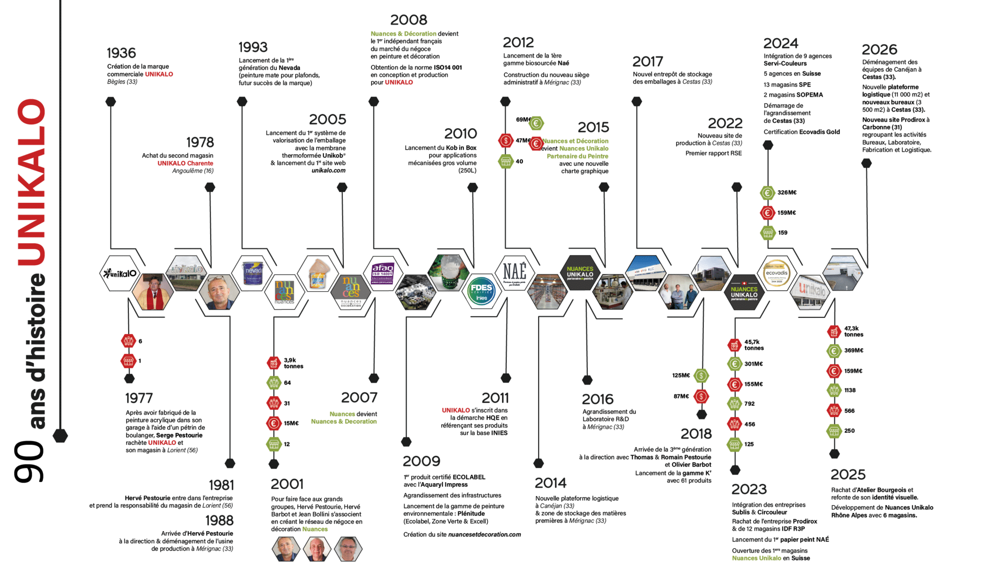 Ces années sont aussi celles de l’expansion support et logistique, avec la construction du nouveau siège à Mérignac en 2012, une nouvelle plateforme à Canéjan en 2014 et l’agrandissement du laboratoire R&D à Mérignac en 2016. Le réseau de distribution est solidifié en 2015 avec sa transformation en Nuances Unikalo Partenaire du Peintre.